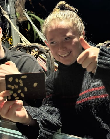 Travelers enjoying a cacao tasting session in a rustic setting.
