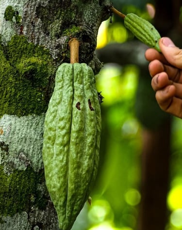 Close-up of ripe cacao pods hanging from a tree branch in the biodiverse forest.