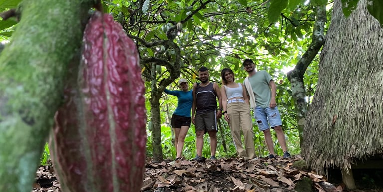 A group of tourists enjoying a cacao tasting session surrounded by lush greenery.