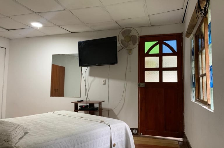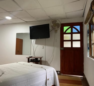 Esta habitación cuenta con todos las acomodaciones como baño privado, ventilador, tv con Apple tv y Amazon prime. Ubicada en la cabaña principal, donde tedras acceso a jardines, mesas de patio, quiosco con hamacas.